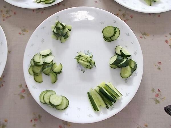 まずは説明を聞きます。実際に切ったきゅうりを見て、何という切り方だったかのテストもありました。緊張します。