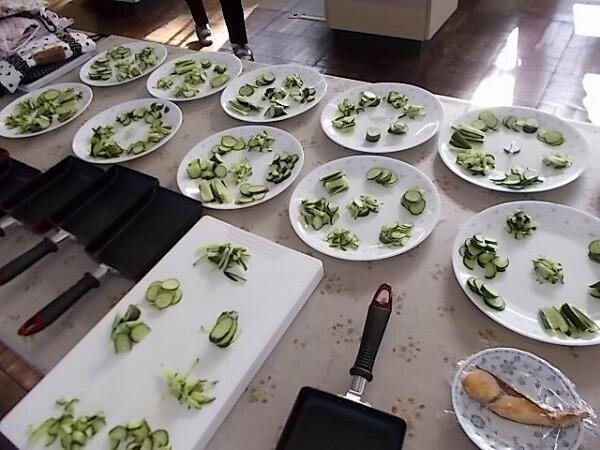 今日の3,4時間目に中学部2年生は調理実習を行いました。きゅうりをいろんな切り方できることと、ぶりの照り焼きを作りました。きゅうりを切ったり、魚を調理したりすることは初めての生徒もいたと思うのですが、皆、一生懸命取り組んでいました。