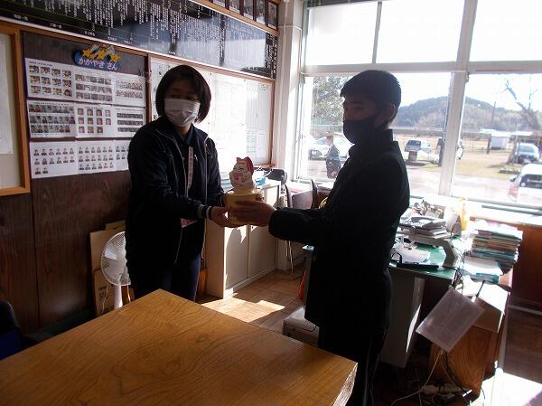 西都市社会福祉協議会の方々が、赤い羽根共同募金を回収に来られました。登校時、寒いなか募金活動を頑張ってくれました。代表児童生徒が校長室で手渡しました。(写真は中学部生徒)。