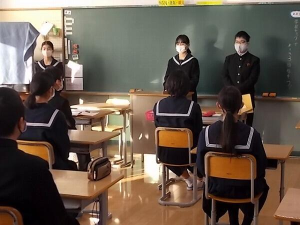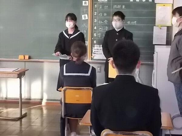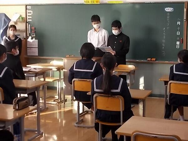 一同に集まっての生徒集会の開催が難しかったため(時間の関係と密集状態になることを避ける観点から)、中学部の朝自習の時間を活用して、各全校専門委員長、生徒会執行部からの報告会を行いました。各全校専門委員長と生徒会会計が各クラスを回り、先月の反省や今月の取組における努力事項の確認、赤い羽根共同募金の結果等を報告いたしました。以下はその時の様子です。