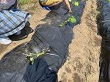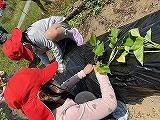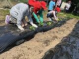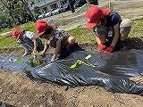 畑の耕耘、施肥、畝づくりとマルチ張りは学級担任の先生が前日までに行いました。児童の皆さんは、その畑で、とても楽しく苗植えを行うことができました。
