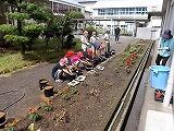 小学部5年生は、本年度も米作りに取り組んでいます。先週種をまいた稲が成長し、本日はバケツに植え替えました。