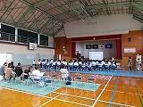 西都児湯地区中学校総合体育大会選手激励会が行われました。選手激励会は、部活動に取り組む意欲や、支えてもらった多くの方への感謝の気持ち及び最後まで全力で戦う気迫やモチベーションを高めること等を目的として行われます。今回の激励会では、各部活動(バレーボール部、軟式野球部、ソフトテニス部)の決意表明の後に、生徒会代表の生徒と校長先生による激励、選手代表による宣誓が行われました。