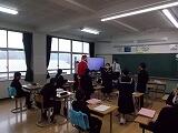 サンタクロースの格好をしたALTの授業が行われています。ALTは、クリスマスだけでなく、季節に合わせたコスチュームで児童生徒を喜ばせてくれます。児童生徒の皆さんが英語を好きになってくれるよう一生懸命です。