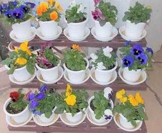 ところで、職員玄関でパンジーやビオラをポットに植えて育てています。どんどんきれいに育っています。
