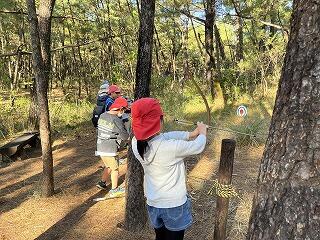 宿泊研修2日目は、しおかぜ追跡ハイキングが、松林内に常設されているクロスカントリーコースで行われました。しおかぜ追跡ハイキングは、コース内に設置された数種類の矢印サインを追跡し、その途中では活動ポイントに用意された様々な課題にグループで挑戦するという活動です。