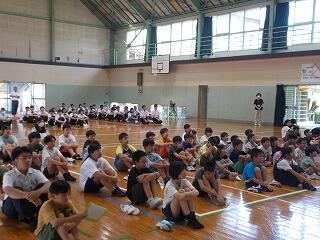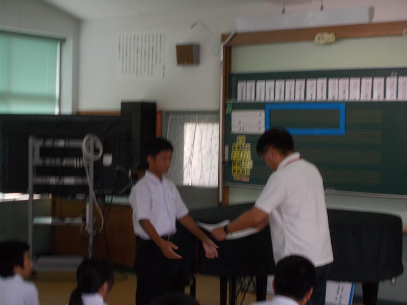 その後、小学部・中学部に分かれて集会がありました。小学部では、愛鳥週間ポスター書道コンクールで入賞した5名の児童の表彰がありました。