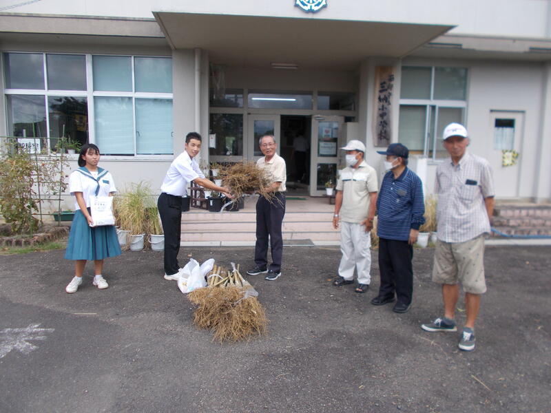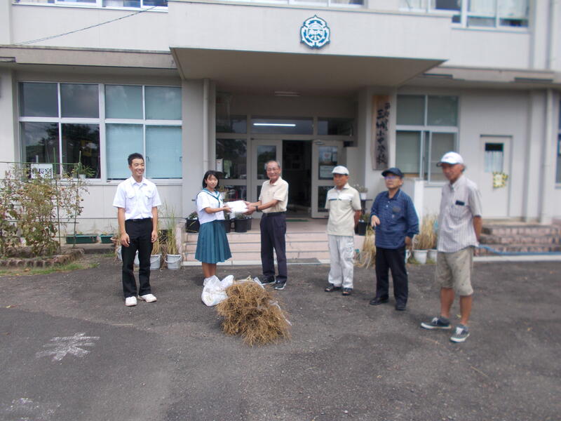 2学期始業の日に、高齢者クラブの皆さまから、竹ぼうきと雑巾をたくさん頂きました。全校生活委員長の3年生 中谷 大路さんと、全校生活副委員長の2年生 長友優花さんが、全校生徒を代表して受け取りました。校内美化のために大切に使わせていただきます。ありがとうございました。