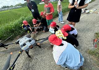今日は、ドローンでの農薬散布についても学習しました。本当の農薬ではなく、水を入れての実際の散布の様子に子どもたちは興奮気味でした。教科書に載っていることも実際に体験すると違いますね。本日もJA青年部の方々のご協力で意義深い学習となりました。