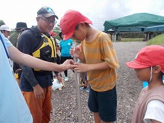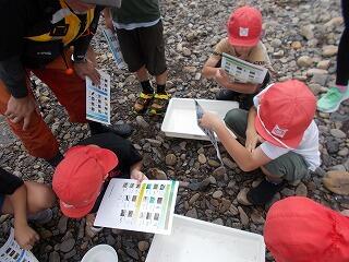宮崎県環境管理課が子どもたちに川への親しみをもってもらうために「水生生物調査」に「自然の音」や「自然の風景」「水のにおい」等の『五感を使った水辺環境指標による水辺調査』があります。それに応募し、実現したものです。