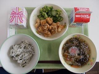 中学部の献立はお楽しみ献立で「減量わかめごはん、むずくスープ、鶏肉のから揚げ、添え野菜、お祝いケーキ」でした。