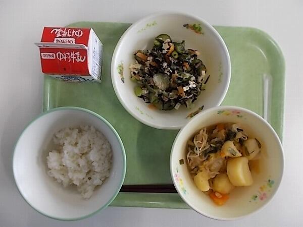 小学部の献立は「麦ご飯、じゃが豚キムチ、ひじきとチ-ズのサラダ」でした。
