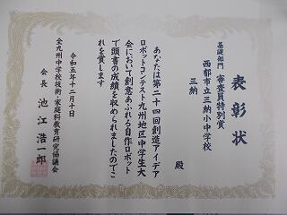 12月9日、10日、九州産業大学で「第24回創造アイデアロボットコンテスト九州地区中学生大会(福岡大会)」が行われました。本校から宮崎県大会で優勝したチーム「三納」が基礎部門に出場しました。基礎部門の試合は、九州各県の予選を突破した36チームで行われました。結果は、予選リーグ2勝0敗、決勝リーグ1勝1敗でべスト12での敗退となりましたが、審査員特別賞をいただきました。