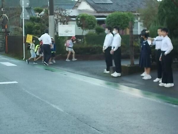 今朝の登校、ボランティアの様子です。中学生はテスト期間中ですので、朝のボランティア活動は6年生が率先して取り組んでいます。
