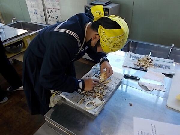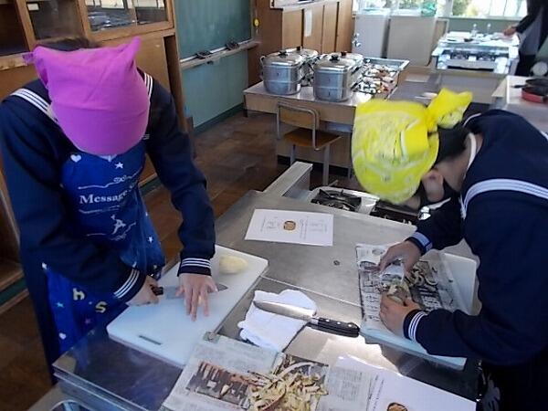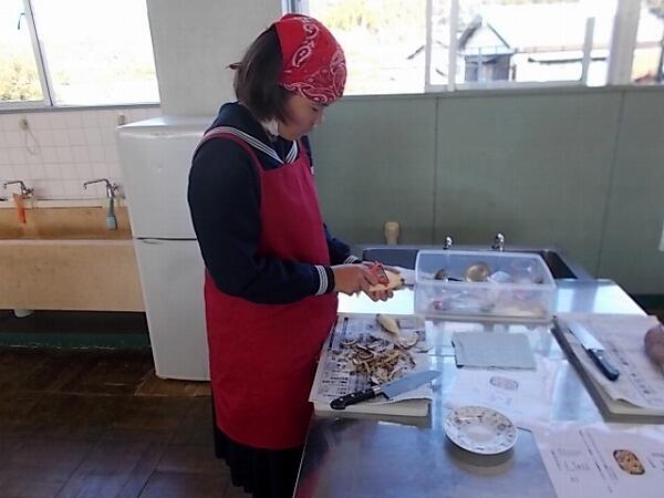本日2校時目に中学部3年生は「幼児のおやつ」という内容で、調理実習を行いました。学校でとれたサツマイモを食材にして、大学芋を作りました。