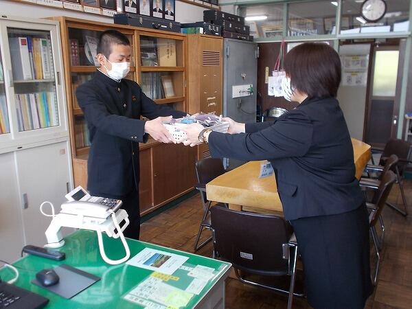 先日、西都市交通指導員協議会平郡支部の荒川様、同三納支部の伊藤様より寄贈していただきましたマスクの贈呈式を行いました。生徒会長の猪股君が児童生徒代表としてマスクを受け取りました。猪股君は「このような時期にマスクを寄贈してくださり、たいへんありがたいです。大事に使わせていただくとともに、いつかは三納地区に恩返しができるような大人になりたいです」と感謝の意を述べました。