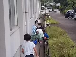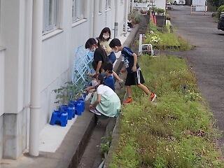 7時55分、1日の始まりを知らせる爽やかなジャズのメロディーが全校に流れます。写真は、放送を流している放送委員の皆さんと、その爽やかな音楽の中で小学部2年生の皆さんが、ミニトマトの生長を観察している様子です。