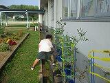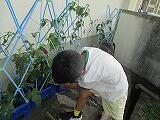 朝の涼しい時間帯に、朝顔やトマトに水をあげてお世話をしている様子や、