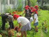 先生と一緒に学級園の草抜きをしている様子が見られます。
