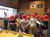 西都市の議場も見学しました。議長のいすに座って、議場の雰囲気を感じ取っていました。