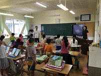 役割分担をして説明をしている2年生、楽しそうに聞いている1年生。