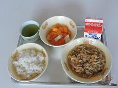 麦ごはん、牛乳、麻婆豆腐、杏仁フルーツ。