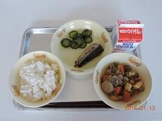 ごはん、牛乳、筑前煮、いわし生姜煮、キュウリのゆかり和え