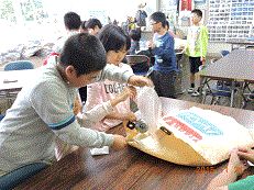 のぞいてみると、この間精米したもち米を小分けしてはかりにかけています。