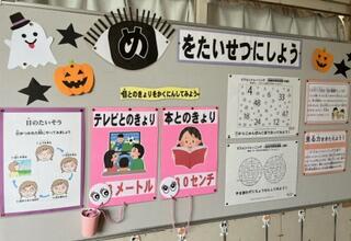 また、保健室の前には、見る力を鍛えるビジョントレーニングや目の体操などが掲示してあります。