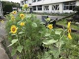 校庭では、ひまわりなどの花々が元気よく咲いていました。