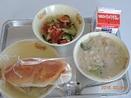 今日の献立は、米粉パン、牛乳、しろはな豆のシチュー、カラフルサラダ。