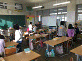 地区担当の先生の教室でこれまでの集団登校を振り返りました。