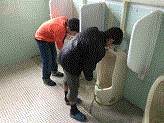 二人は、担当する便器が決まっていて、そうじが始まるとすぐに棒たわしでみがきはじめます。