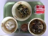 減量コーンごはん、肉うどん、カルシウムたっぷりサラダ、焼きプリンタルトです。