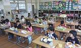 給食開始から約10日ほど経過した1年生です。好き嫌いがあったり、量の調節がうまくいかなかったりしていますが、給食時間の過ごし方もずいぶん身につき、がんばって食べています。