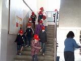 1年生は、訓練前の学習中です。3年生は、階段を静かに下りてきました。