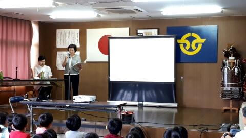 学校が空調工事のため、近くの都於郡地区館をお借りして、登校日を実施しました。全校朝会では、昨年の広島市の児童作文「平和への誓い」を校長先生が読まれ、その後、長崎からお招きした2人の講師による、平和について考える「被爆体験朗読会」を開きました。子どもたちは、講師のお話をみんな真剣に聞いていました。
