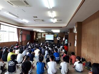 学校が空調工事のため、近くの都於郡地区館をお借りして、登校日を実施しました。全校朝会では、昨年の広島市の児童作文「平和への誓い」を校長先生が読まれ、その後、長崎からお招きした2人の講師による、平和について考える「被爆体験朗読会」を開きました。子どもたちは、講師のお話をみんな真剣に聞いていました。
