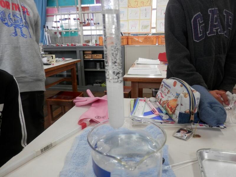 6年生では,理科の参観授業で,「試験管の中で,雪を降らせよう!」の実験を行いました。どの班も見事成功して,保護者の方々も興味深げにご覧になっていました。