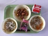 鮭菜飯、ワンタンスープ、鶏の唐揚げ、エクレアです。