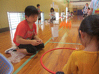 生活科の秋祭りで、1・2年生と保育所の園児が、どんぐりごまや松ぼっくりなどを作り、それらを使ってゲームをしました。また。ペットボトルを使ったボーリングもしました。