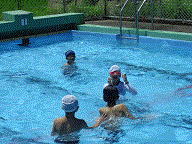 プールに入る前に1年生がシャワーをしています。