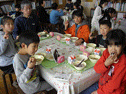 きょうが、4年生と一緒の最後の給食でした。どの班も、最後ということで、初めは少し会話が少ないように感じました。その後だんだんといつものように楽しい会話をしていました。