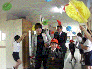4月13日(木)の3校時に、1年生を迎える会が体育館で実施されました。1年生が,担任の先生と一緒に、上級生が作った花のアーチを通りました。にこにこ笑顔で、入場しました。
