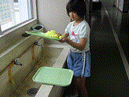 山田分校では、給食後、自分が使ったおぼんを洗うようにしています。ところが、お友達のおぼんまで、洗ってあげる優しい行動をする人が何人もいます。分校の子ども達は、優しいので感心です。