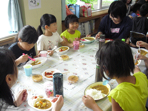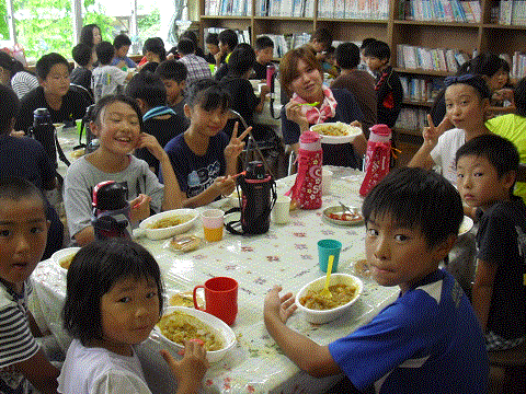 今日は、子ども達が、とても楽しみにしている分校レクリェーションが行われました。水泳やドッジボールをしたり、カレーライス作りをしたりしました。ドッジボールでは、汗をびっしょりかきながら遊んでいました。カレーライス作りでは、みんなで協力して楽しく料理していました。子ども達にとって、楽しい夏休みの思い出ができました。