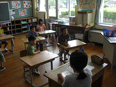 9時30分から全校朝会を実施しました。後半は、平和学習を行いました。まず、今から72年前の8月15日に太平洋戦争が終わったこと、8月6日と8月9日に原子爆弾が落とされたこと等を話しました。さらに、特攻によって(特攻機、人間魚雷回天等)たくさんの若者が死んでいったことも話しました。子ども達は、悲しそうな顔をして聞いていました。