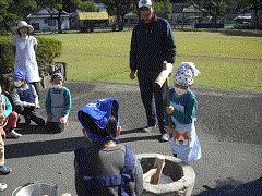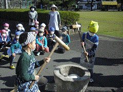 13時30分より、いよいよもちつき大会が始まりました。1年生の方から、もちをついていきましたが、思っていたよりも上手にできました。山田保育所の子ども達も後から、もちをつきました。