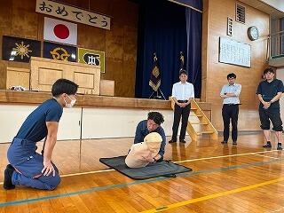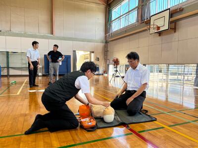 午後の職員研修では、西都消防署からお二人の消防士を招いて救急救命法を研修しました。