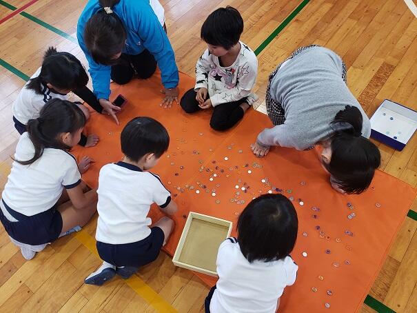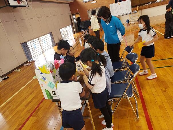 2年生が1年生にどんぐりなどを使って、遊びを紹介しています。